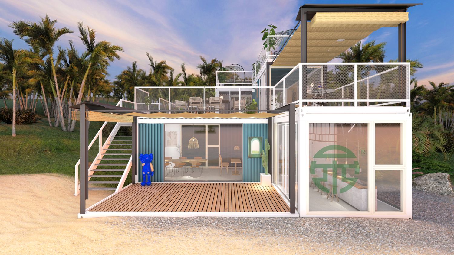 • Based on steel structure and light wall panels, composed of top structure, base structure, corner posts and 14 interchangeable wall panels.